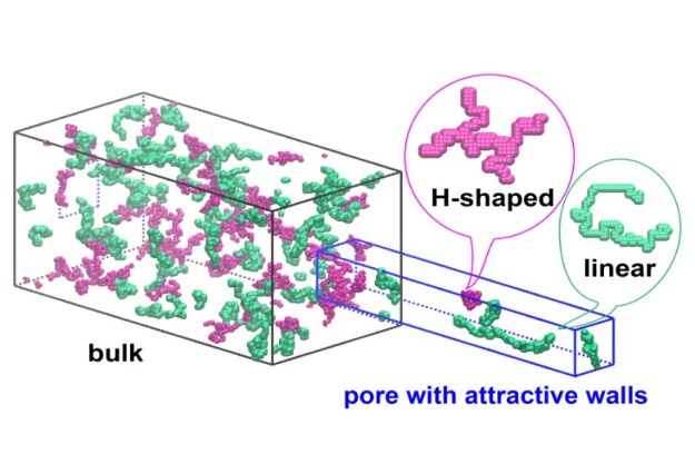 The image is a snapshot of the simulation box which illustrates the separation of mixtures of linear and H-shaped polymers by Monte Carlo simulations. For more details see: Wang at al Polymer 104 (2016) 10-21.