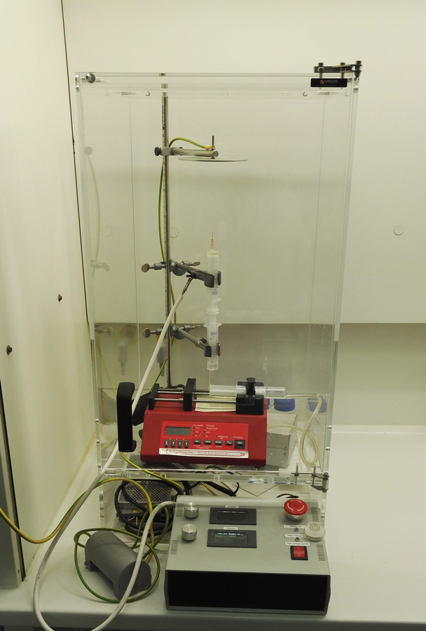 Laboratory electrospinning equipment for preparation of photoactive nanofiber membranes. The laboratory setup consists of a syringe needle connected to a high-voltage (5 to 50 kV) direct current power supply, a syringe pump, and a grounded collector.