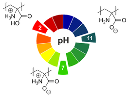 Well-defined copolymers and block copolymers featuring charge-tunable groups in the side chain are ideal materials for the design and modification of interfaces in various settings [1] or for controlling and directing self-assembly processes [2]. We herein report on the synthesis of polyelectrolytes, polyampholytes, and polyzwitterions as well as the corresponding block copolymers using free radical and controlled radical polymerization techniques. One key building block in our setting is polydehydroalanine (PDha),[3,4] a polyzwitterion with high charge density and, depending on the pH, tunable net charge (Figure 1). Apart from interesting solution characteristics [5], we have used PDha and partially protected derivatives as coating materials for iron oxide nanoparticles or within polyelectrolyte multilayers and could show that this allows reversible adsorption / desorption experiments using various oppositely counterparts, including proteins and model pollutants such as methylene blue [6,7]. Besides PDha, we are also interested in the incorporation of polymerizable naphthol derivatives to create polymeric photoacids which show different charge characteristics and solubility in aqueous environment with and without irradiation [8]. Finally, once charge-tunable building blocks are introduced as responsive segment in block copolymer membranes, electrostatic adsorption can be used to immobilize powerful oxidation catalysts such as polyoxometalates based on Mn and V. We could show that such self-supporting hybrid and heterogeneous oxidation catalysts can be used in different model reactions both under static conditions as well as under flow (Figure 2)[9]