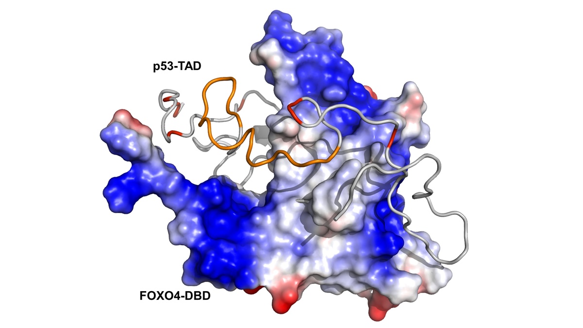 The transcription factors and tumor suppressors FOXO4 and p53 regulate aging, and their deregulation is associated with numerous diseases, including cancer. Under stress conditions, cellular senescence is promoted by p53 sequestration and senescence-associated protein p21 transcriptional upregulation induced by interactions between the FOXO4 Forkhead DNA-binding domain and the p53 transactivation domain. In this study, research teams from the Department of Physical and Macromolecular Chemistry (website), the Institute of Organic Chemistry and Biochemistry of the CAS (website), and the Institute of Physiology of the CAS (website) have demonstrated that the interactions between p53 and FOXO4 exhibit significant heterogeneity. Utilizing nuclear magnetic resonance and molecular modeling, the researchers demonstrated that the transactivation domain of p53 primarily interacts with the N-terminal region of the FOXO4 Forkhead domain, while retaining a high degree of flexibility in the complex. The study further demonstrated that p53 interacts with FOXO4 through multiple binding modes, resulting in substantial structural variability of the complex.