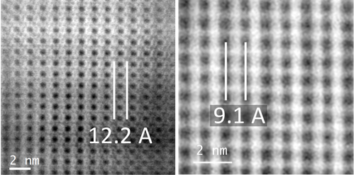 Cs-corrected STEM-ADF images of IWW (left) and IPC-18 (right) zeolites showing the decrease in interlayer distance caused by the transformation of zeolite containing relatively large interlayer units (cubes) into material having contracted interlayer connectivity (squares).
