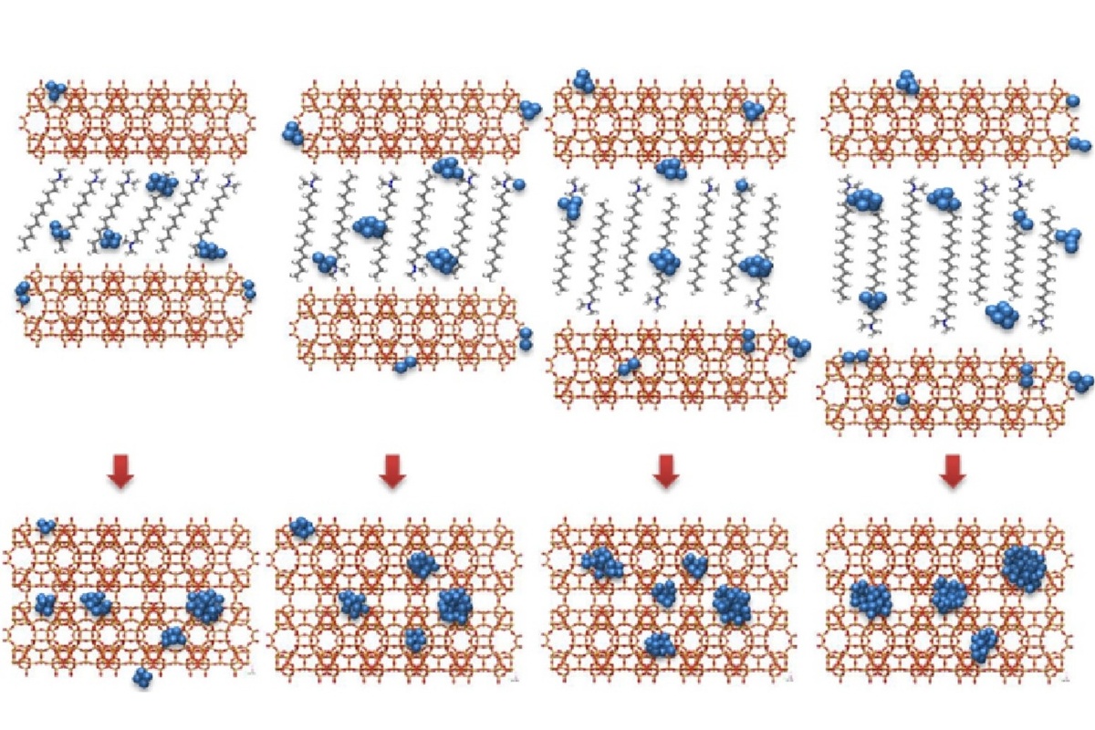 Zeolites doped with metal nanoparticles have shown the outstanding activity in many processes involving heterogeneous catalysis. The size of metal nanoparticles plays a decisive role in the performance of zeolite catalysts. However, the precise control of the size of nanoparticles is still limited. Herein, we present the synthesis of Pt-MWW zeolites with controllable nanoparticle size using a series of surfactants with different alkyl chain lengths for swelling of layered MCM-22 P. The interlayer distances of swollen materials increases with the length of the surfactant from 1.06 nm (C12OH) to 2.89 nm (C18OH). During swelling, the Pt nanoparticles were intercalated to the interlayer space of MCM-22 P. Further calcination resulted in Pt-MWW materials showing similar morphologies, textural properties and Pt content despite the differences in the initial interlayer distances. The factor that differentiated the synthesized materials was the average diameter of metal nanoparticles. As a result, the average size of Pt nanoparticles increased from 0.85 nm (MCM-22-C12OH-Pt) to 2.04 nm (MCM-22-C18OH-Pt) which is related to the length of the hydrocarbon chain of the surfactant used for the swelling process.